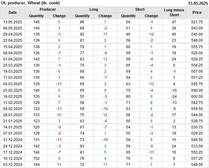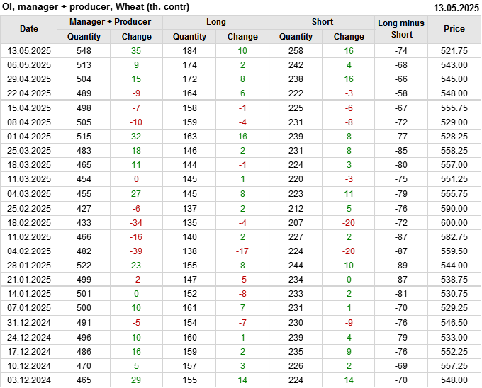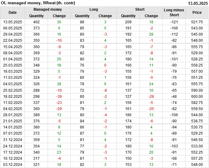 За прошедшую неделю, 07.05.25 — 13.05.25, разница между длинными и короткими позициями управляющих увеличилась на 14.6 тыс. контрактов. В тоже время, цена упала на 21.25 цента.