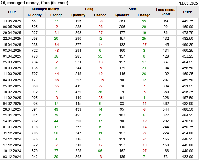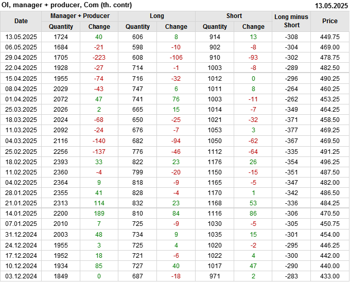 За прошлую неделю, 07.05.25 — 13.05.25, разница между длинными и короткими позициями управляющих увеличилась на 93.3 тыс. контрактов. В тоже время, цена упала на 19.25 цента.