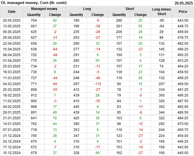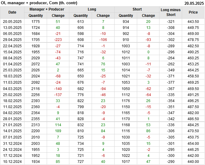 За прошлую неделю, 14.05.25 — 20.05.25, разница между длинными и короткими позициями управляющих увеличилась на 31.2 тыс. контрактов. В тоже время, цена упала на 6.25 цента.