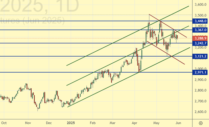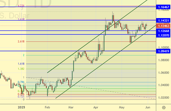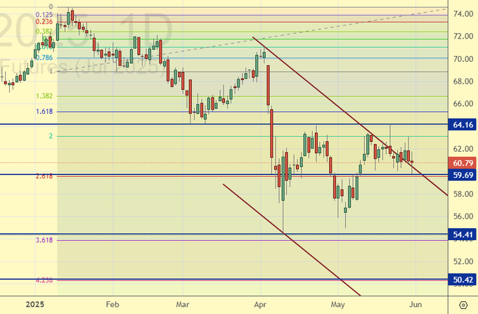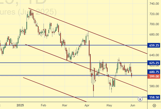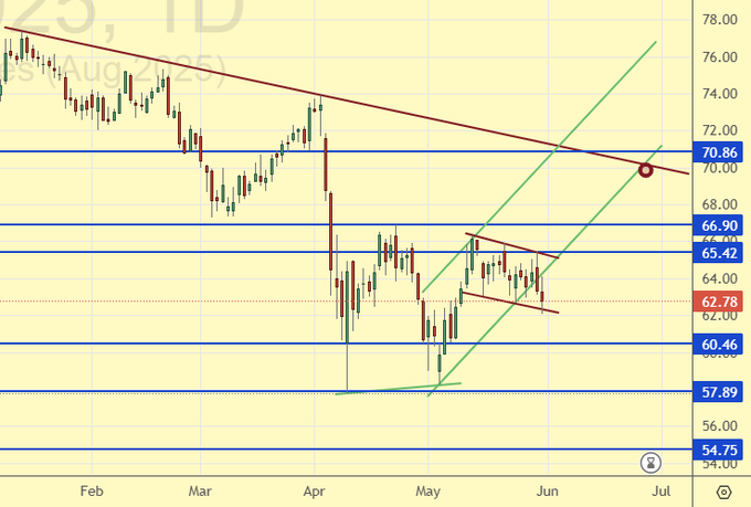 Сценарий роста: рассматриваем июньский фьючерс, дата экспирации 19 июня. Сохраняем плавучесть. Переговоры в понедельник по Украине непредсказуемы. Рекомендаций покупать не будет.