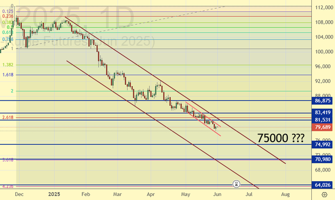 Сценарий роста: перешли на июльский фьючерс, дата экспирации 25 июня. Воздержимся от покупок. Пока вне рынка. Ждем пробой агрессивного падающего тренда вверх.