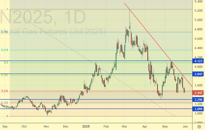 Для России может стать затруднительным предоставление большего объема нефти на внешний рынок. Если даже внутри страны найдут мощности для увеличения поставок, то перевезти эти объемы может быть физически затруднительно. Недруги не дремлют. Поэтому, с одной стороны будем видеть рост добычи со стороны картеля. А с другой, беспокойство в возможности, что-либо продавать из России. С некоторой тревогой ждем будет ли прогресс на переговорах по Украине 2 июня.