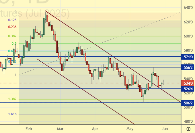 Соя не захотела расти, что можно было предположить и ранее, глядя на фундаментальные показатели. Минорные настроения по данной масличной, и одновременно насыщенной белком культуре, послужили катализатором по кукурузе, которая выбрала путь вниз на фоне успехов Бразилии, и в целом безопасной ситуации с сильными дождями на юге США, что ранее вызывало беспокойство. Если рынок не найдет повода для роста, а он может быть, если Россия и Украина не покажут прогресса на переговорах, то тогда нас ждет попытка протестировать 400.0 центов за бушель по кукурузе.