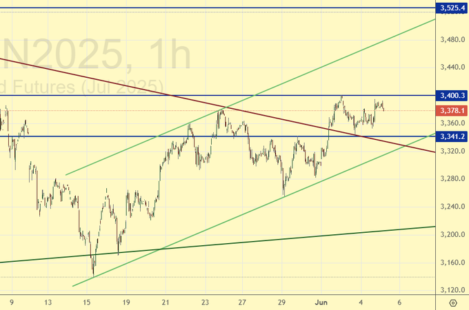 Покупка: нет. Кто в позиции от 3367, перенесите стоп на 3330. Цель: 3800.