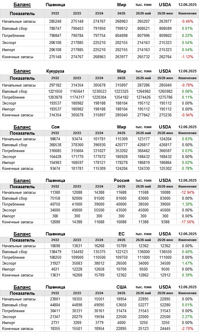 За прошедший месяц министерство сельского хозяйства США (USDA) на 12.06.2025 пересмотрело Баланс пшеницы для Мира в сезоне 25/26 следующим образом: