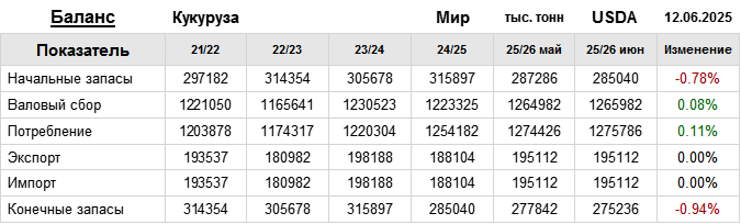 За прошедший месяц министерство сельского хозяйства США (USDA) на 12.06.2025 пересмотрело Баланс кукурузы для Мира в сезоне 25/26 следующим образом:
