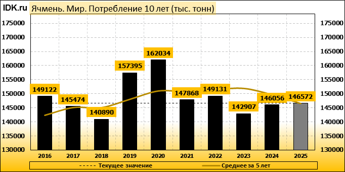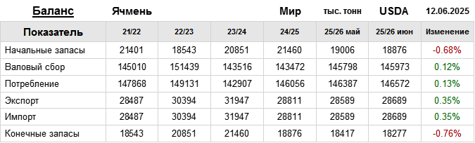 За прошедший месяц министерство сельского хозяйства США (USDA) на 12.06.2025 пересмотрело Баланс ячменя для Мира в сезоне 25/26 следующим образом: