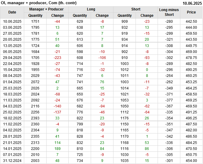 За прошлую неделю, 04.06.25 — 10.06.25, разница между длинными и короткими позициями управляющих увеличилась на 16.2 тыс. контрактов. В тоже время, цена упала на 1.5 цента.