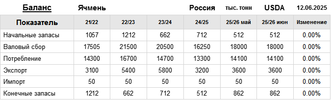 За прошедший месяц министерство сельского хозяйства США (USDA) на 12.06.2025 пересмотрело Баланс ячменя для России в сезоне 25/26 следующим образом: