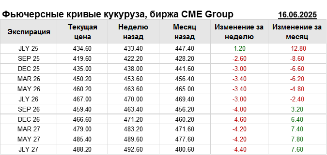 На 16.06.2025 стоимость кукурузы на бирже CME Group по контракту JLY 25 составила 434.6 цента за бушель. За прошедшую неделю стоимость кукурузы на площадке CME Group выросла на 1.2 цента/бушель. Как мы видим на графике, фьючерсная кривая имеет периоды, когда более дальний фьючерс дешевле ближнего. Состояние бэквардации наблюдаем на следующих контрактах: SEP 25; SEP 26. Таким образом, трейдеры предполагают, что возможно превалирование предложения над спросом в указанные периоды.