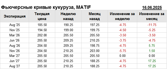 На 16.06.2025 стоимость кукурузы на бирже MATIF по контракту Aug ’25 составила 185.5 евро за тонну. За прошедшую неделю стоимость кукурузы на европейской площадке упала на 4.75 евро/тонна. Как мы видим на графике, фьючерсная кривая имеет периоды, когда более дальний фьючерс дешевле ближнего. Состояние бэквардации наблюдаем на следующих контрактах: Aug ’26. Таким образом, трейдеры предполагают, что возможно превалирование предложения над спросом в указанные периоды.