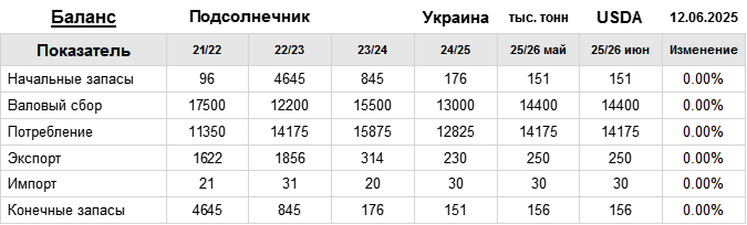 За прошедший месяц министерство сельского хозяйства США (USDA) на 12.06.2025 пересмотрело Баланс подсолнечника для Украины в сезоне 25/26 следующим образом: