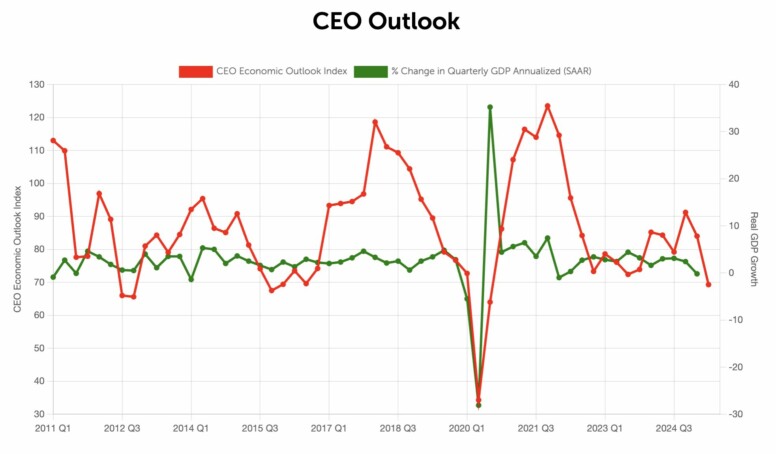 Руководители компаний обеспокоены. Из исследования Business Roundtable, посвященного экономическим перспективам руководителей за 2 квартал: “Общий индекс снизился на 15 пунктов по сравнению с прошлым кварталом до 69, что значительно ниже его исторического среднего значения в 83 пункта. Это снижение является результатом снижения всех трех подиндексов, вызванного изменением планов и ожиданий генерального директора в сторону понижения, особенно в подиндексе занятости“.