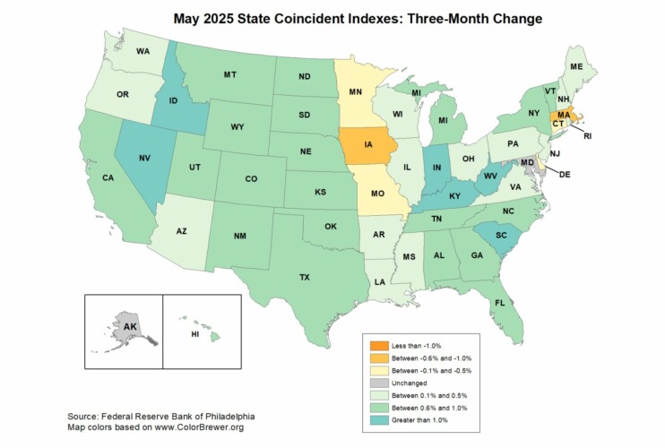 Большинство штатов США продолжают расти. Из отчета ФРБ Филадельфии по совпадающим индексам за май: «За последние три месяца индексы выросли в 42 штатах, снизились в шести штатах и оставались стабильными в двух, при этом трехмесячный диффузионный индекс составил 72. Кроме того, за прошедший месяц индексы выросли в 38 штатах, снизились в восьми и остались стабильными в четырех, при этом за один месяц индекс распространения составил 60”.