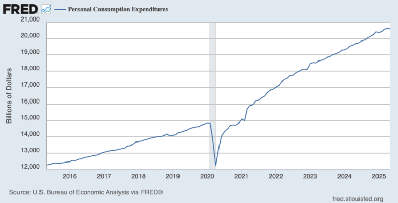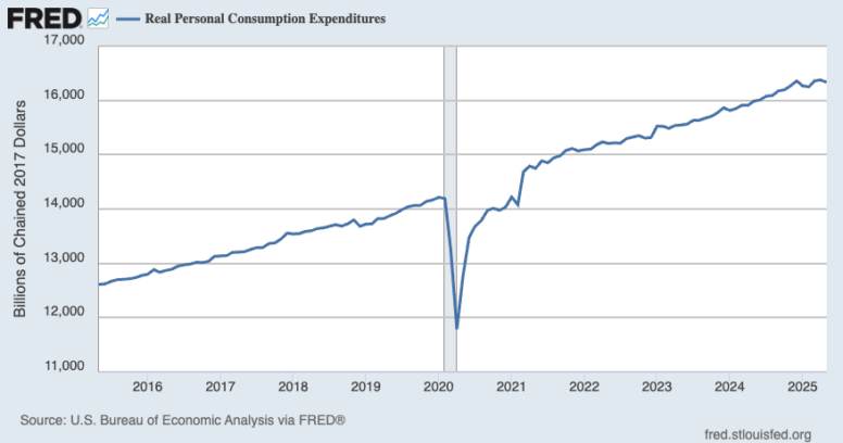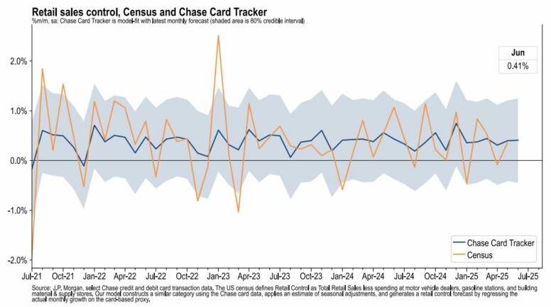 Данные о расходах по карточкам неоднозначны. От JPMorgan: “По состоянию на 17 июня 2025 года наши данные о расходах по потребительским картам Chase (без корректировок) были на 1,2% выше, чем в тот же день прошлого года. Основываясь на данных Chase Consumer Card по состоянию на 17 июня 2025 года, наша оценка июньского показателя розничных продаж по переписи населения США в месячном выражении составляет 0,41%.”