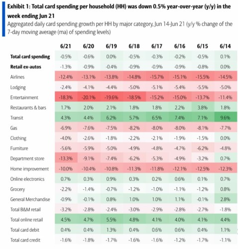 От BofA: “Согласно агрегированным данным BAC по кредитным и дебетовым картам, общие расходы по карточкам за неделю, закончившуюся 21 июня, снизились на 0,5% в годовом исчислении. По сравнению с прошлой неделей, в наших категориях расходы в универмагах, сфере развлечений и транспорта сократились больше всего в годовом исчислении. В то же время, расходы на жилье, авиалинии и обустройство дома выросли больше всего по сравнению с прошлой неделей.“