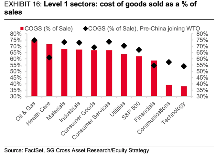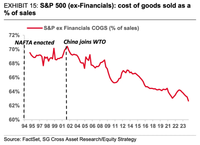 «Американские компании явно выиграли от глобализации», — пишут аналитики Societe Generale. «Индекс S&P 500 (за исключением финансовых показателей) также выиграл с точки зрения затрат, поскольку стоимость проданных товаров, выраженная в процентах от объема продаж, снизилась на 700 базисных пунктов с момента вступления Китая в ВТО (Всемирная торговая организация)».