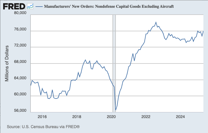 Инвестиционная активность бизнеса улучшается. Заказы на капитальные товары незащищенного назначения, за исключением самолетов, также известные как основные капитальные затраты или инвестиции в бизнес, выросли на 1,7% до 76,0 млрд долларов в мае.