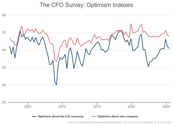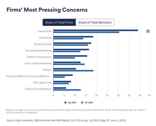 Финансовые директора обеспокоены. Из опроса финансовых директоров ФРБ Ричмонда за 2 квартал: “Прогнозы лиц, принимающих финансовые решения, ухудшились во втором квартале 2025 года на фоне рекордной обеспокоенности по поводу влияния торговой политики. Сорок процентов респондентов указали, что тарифы и торговая политика были насущной проблемой для их компаний в этом квартале, и это рекордная доля респондентов, которые ссылались на ту же проблему во втором квартале 2020 года.“