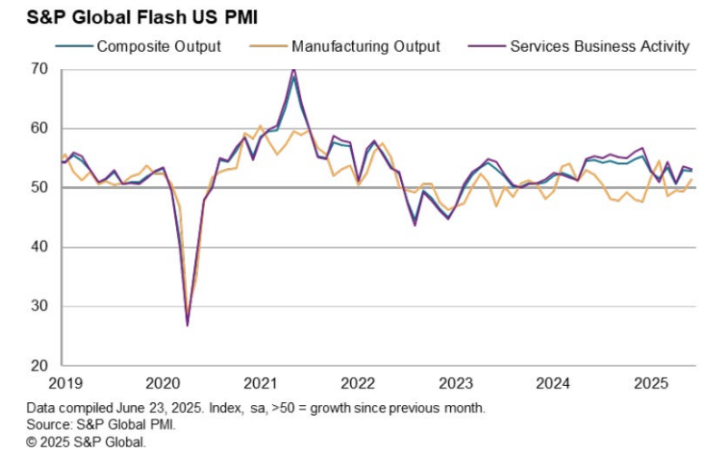 Обзор активности ухудшается. Из июньского отчета S&P Global по индексу деловой активности в США: “Предварительные данные по индексу деловой активности в США за июнь показали, что экономика США продолжила расти в конце второго квартала, но перспективы остаются неопределенными, в то время как инфляционное давление резко возросло за последние два месяца. Хотя деловая активность и новые заказы продолжали расти в июне, темпы роста замедлились на фоне сокращения экспорта как товаров, так и услуг. Кроме того, в то время как внутренний спрос, особенно в обрабатывающей промышленности, укрепился, что способствовало росту занятости, это отчасти отражает увеличение запасов, что, в свою очередь, часто связано с опасениями по поводу повышения цен и проблем с поставками, вызванных тарифами. В ближайшие месяцы такой рост, вероятно, прекратится.”