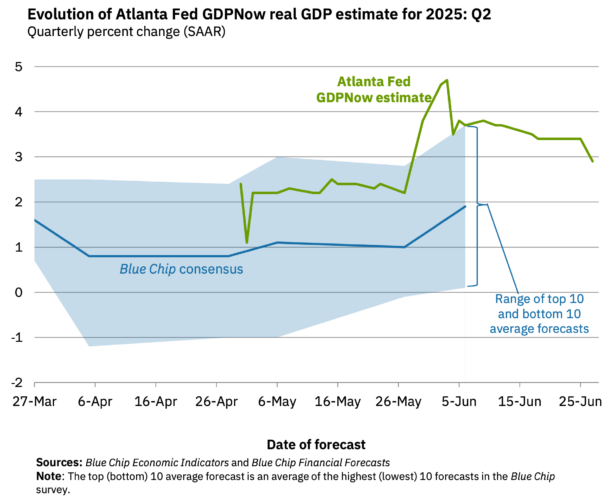 Краткосрочные оценки роста ВВП позитивны. Модель GDPNow ФРС Атланты предполагает, что реальный рост ВВП увеличится на 2,9% во втором квартале.