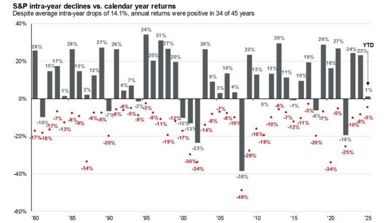 Резкие распродажи на фондовом рынке — это нормально: инвесторы всегда должны быть морально готовы к крупным распродажам на фондовом рынке. Это часть сделки, когда вы инвестируете в класс активов, чувствительный к постоянному потоку хороших и плохих новостей. С 1950 года в индексе S&P 500 наблюдалась среднегодовая максимальная просадка (т.е. крупнейшая распродажа за год) в размере 14%.