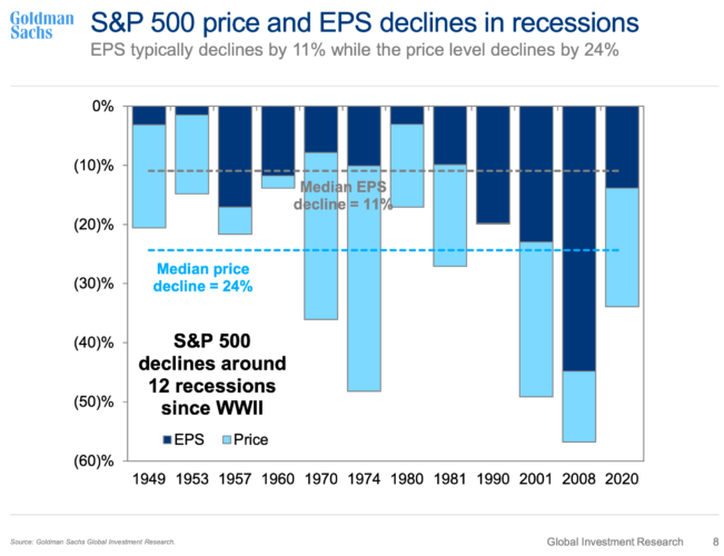 Рис 31. Индекс S&P 500 и прибыль на акцию снижаются в периоды экономического спада Источник: Goldman Sachs