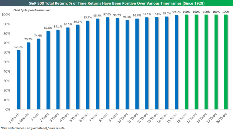 На фондовом рынке время-деньги: с 1928 года индекс S&P 500 приносил положительную совокупную прибыль более чем в 89% случаев за все пятилетние периоды. Это довольно хорошие показатели. Если вы увеличите временные рамки до 20 лет, то увидите, что еще не было периода, когда индекс S&P 500 не приносил положительной прибыли.