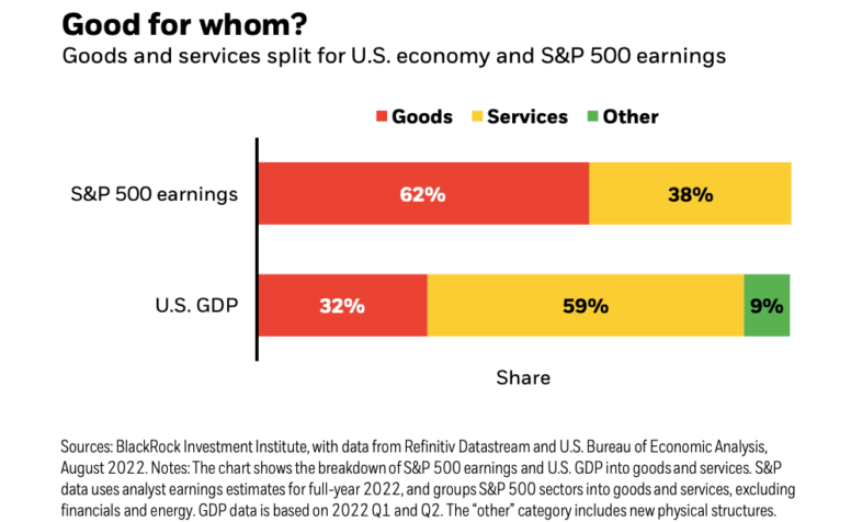 Рис 34. Доля товаров и услуг в экономике США и доходах S&P 500 Источники: Инвестиционный институт BlackRock