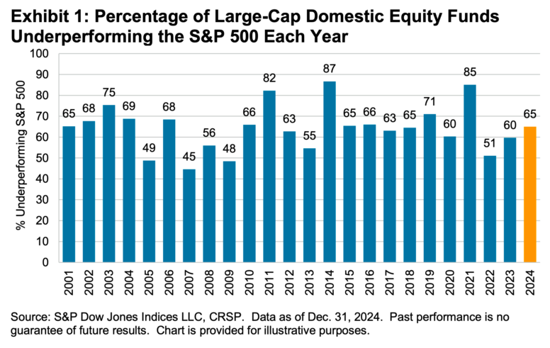 Большинство профессионалов не могут победить рынок: по данным S&P Dow Jones Indexes (SPDJI), в 2024 году показатели 65% управляющих фондами акций с крупной капитализацией в США были ниже индекса S&P 500. По мере того, как вы расширяете временной горизонт, цифры становятся все более мрачными. За трехлетний период 85% не справились с поставленной задачей. За 10-летний период 90% не справились с поставленной задачей. А за 20-летний период 92% не справились с поставленной задачей. Этот показатель за 2023 год является результатом 14 лет подряд, в течение которых большинство управляющих фондами в этой категории отставали от индекса.