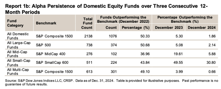 В отчете SPDJI также рассматривались показатели фондов по сравнению с их контрольными показателями за последние три года. Из 738 американских фондов акций с крупной капитализацией, отслеживаемых SPDJI, 50,68% превысили индекс S&P 500 в 2022 году. Всего на 5,08% выше индекса S&P за два года, закончившихся в 2023 году. И только на 2,14% выше индекса за три года, закончившихся в 2024 году.