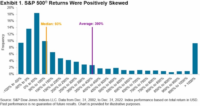 Шансы не в пользу тех, кто занимается подбором акций: подбор акций в попытке превзойти среднерыночные показатели — невероятно сложная задача, которая иногда приводит к потере денег. Большинство профессиональных специалистов по подбору акций не в состоянии делать это постоянно. Одна из причин этого заключается в том, что доходность большинства акций не превышает среднего уровня. Согласно данным S&P Dow Jones Indexes, только 24% акций, входящих в S&P 500, в период с 2000 по 2022 год превысили среднюю доходность по акциям. За этот период средняя доходность акций S&P 500 составила 390%, в то время как средняя стоимость акций выросла всего на 93%.