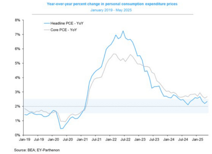 Инфляция остается умеренной. Индекс цен на личные потребительские расходы (PCE) в мае вырос на 2,3% по сравнению с прошлым годом. Базовый индекс цен PCE — предпочтительный показатель инфляции, используемый Федеральной резервной системой (ФРС), — вырос за месяц на 2,7% по сравнению с апрельским показателем в 2,6%. Хотя он выше целевого показателя ФРС в 2%, он остается вблизи самого низкого уровня с марта 2021 года.