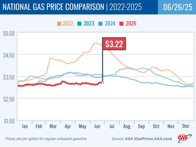 Цены на бензин растут. От AAA: “Авиаудары США в минувшие выходные привели к резкому росту цен на нефть в воскресенье вечером, когда цена на нефть подскочила до 78 долларов за баррель. К понедельнику это быстро прошло, и по состоянию на сегодняшнее утро цены на нефть вернулись к уровню, который был до конфликта. Поскольку День независимости не за горами, а 61,6 миллиона туристов готовятся отправиться в путь на следующей неделе, цены на бензин могут немного вырасти. Средняя цена за галлон обычного бензина по стране составляет 3,22 доллара, что на два цента выше, чем на прошлой неделе, и на 27 центов дешевле, чем в это же время в прошлом году.”