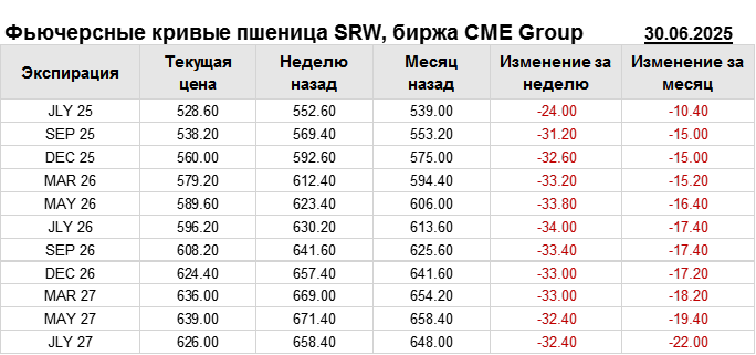 На 30.06.2025 стоимость пшеницы SRW на бирже CME Group по контракту JLY 25 составила 528.6 цента за бушель. За прошедшую неделю стоимость пшеницы SRW упала на 24 цента/бушель. Как мы видим на графике, фьючерсная кривая имеет периоды, когда более дальний фьючерс дешевле ближнего. Состояние бэквардации наблюдаем на следующих контрактах: JLY 27. Таким образом, трейдеры предполагают, что возможно превалирование предложения над спросом в указанные периоды.
