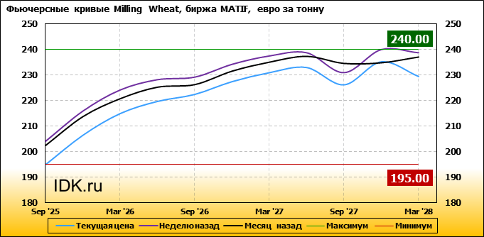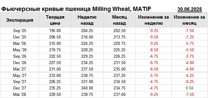 На 30.06.2025 стоимость пшеницы Milling Wheat на бирже MATIF по контракту Sep ’25 составила 195 евро за тонну. За прошедшую неделю стоимость пшеницы Milling Wheat упала на 9.25 евро/тонна. Как мы видим на графике, фьючерсная кривая имеет периоды, когда более дальний фьючерс дешевле ближнего. Состояние бэквардации наблюдаем на следующих контрактах: Sep ’27; Mar ’28. Таким образом, трейдеры предполагают, что возможно превалирование предложения над спросом в указанные периоды.