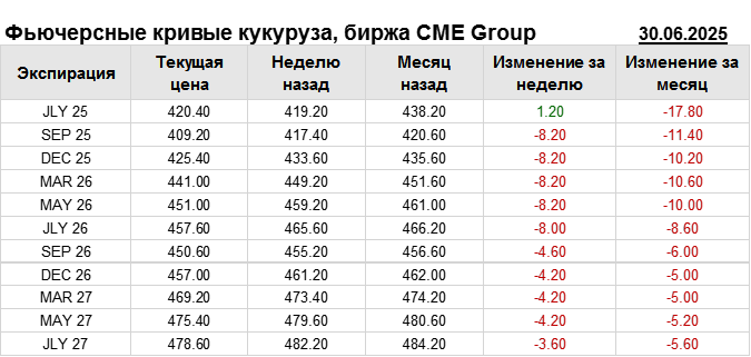 На 30.06.2025 стоимость кукурузы на бирже CME Group по контракту JLY 25 составила 420.4 цента за бушель. За прошедшую неделю стоимость кукурузы на площадке CME Group выросла на 1.2 цента/бушель. Как мы видим на графике, фьючерсная кривая имеет периоды, когда более дальний фьючерс дешевле ближнего. Состояние бэквардации наблюдаем на следующих контрактах: SEP 25; SEP 26. Таким образом, трейдеры предполагают, что возможно превалирование предложения над спросом в указанные периоды.