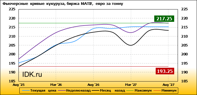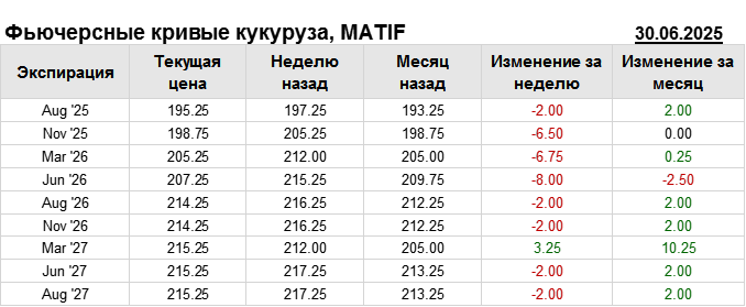 На 30.06.2025 стоимость кукурузы на бирже MATIF по контракту Aug ’25 составила 195.25 евро за тонну. За прошедшую неделю стоимость кукурузы на европейской площадке упала на 2 евро/тонна. Как мы видим на графике, фьючерсная кривая имеет периоды, когда более дальний фьючерс дешевле ближнего.