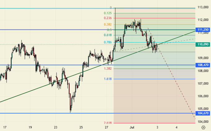 Продажа: возможна. Кто в позиции от 111410, перенесите стоп на 112200. Цель: 95000.