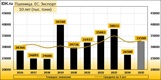 Экспорт: оценивается в 32500 тысяч тонн. За месяц показатель упал на -5.8 процента.