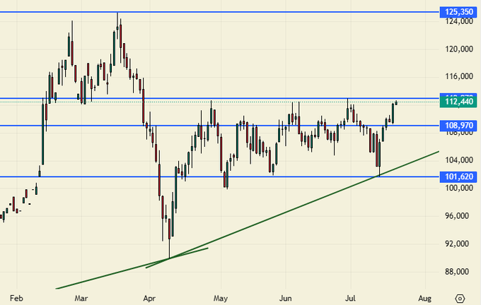 Сценарий роста: рассматриваем сентябрьский фьючерс, дата экспирации 18 сентября. Пройти выше 113000 пока не получилось. Если это произойдет на следующей неделе, то можем пойти вверх.