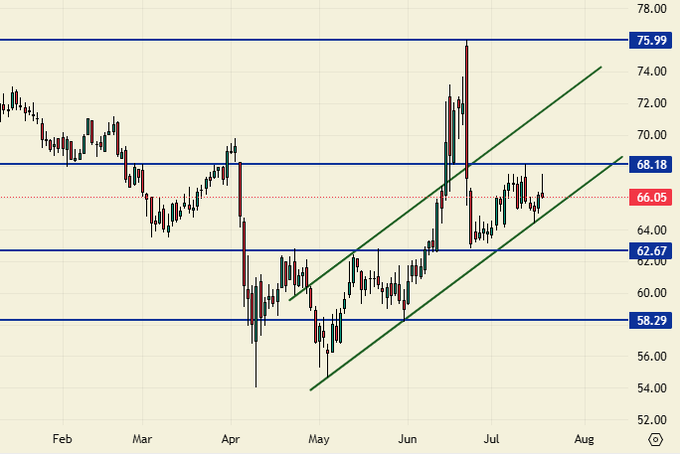 Сценарий роста: рассматриваем августовский фьючерс, дата экспирации 31 июля. При подходе к 58.00 можно купить.
