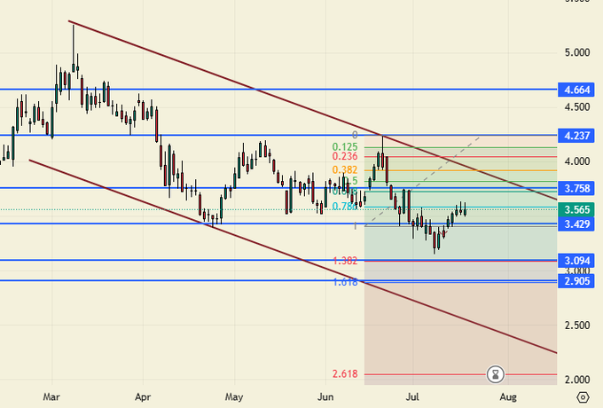 Сценарий роста: рассматриваем сентябрьский контракт, дата экспирации 12 сентября. Расти будет сложно на фоне хороших видов на урожай. Пока не покупаем.