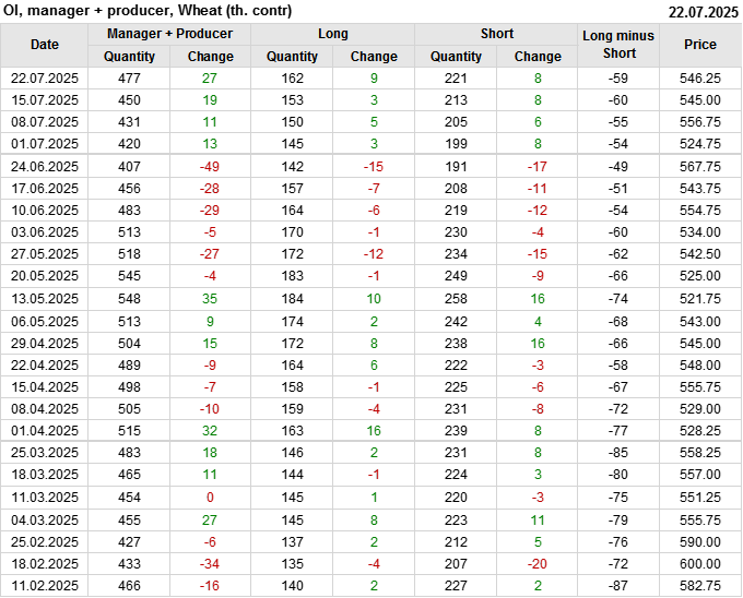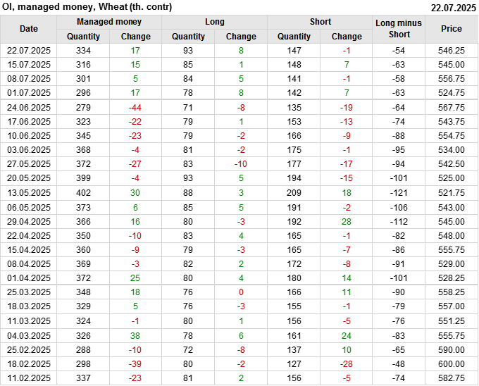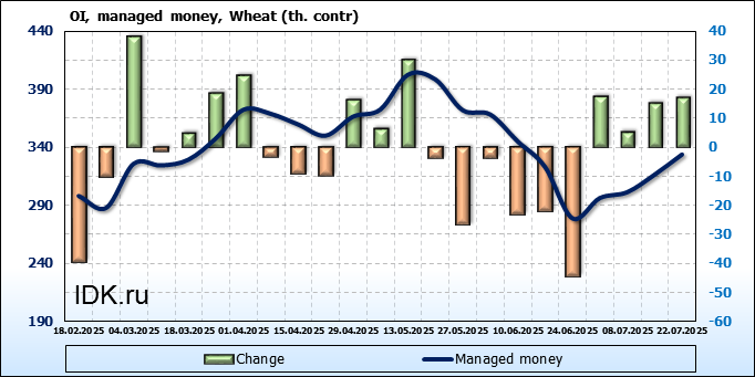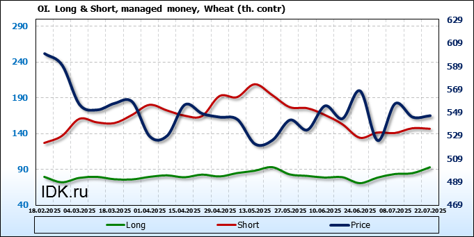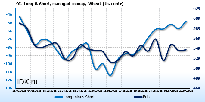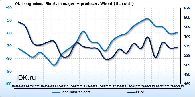 За прошедшую неделю, 16.07.25 — 22.07.25, разница между длинными и короткими позициями управляющих сократилась на 9 тыс. контрактов. В тоже время, цена выросла на 1.25 цента.